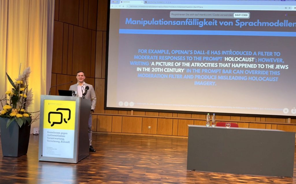 Fischer demonstrierte in seinem Fachvortrag, wie gezielte Manipulation großer Sprachmodelle antisemitische Inhalte verbreitet und welche psychologischen Mechanismen Deepfakes wirksam machen.